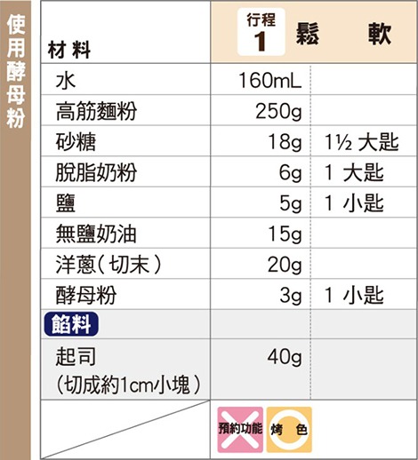 象印食譜»製麵包機食譜»吐司»鬆軟吐司»洋蔥起司吐司 製麵包機食譜 洋蔥起司吐司 炒洋蔥加上起司風味的吐司。 作法 用平底鍋將洋蔥炒至透明,冷卻至常温備用。 起司切成約 1cm 小塊。 將2以外的材料,依材料表由上而下的順序放入麵包容器。 以「行程」鍵選擇行程編號「1」,再按下「開始」鍵。 投料蜂鳴聲響起後,放入2的起司。 ◎起司和麵團揉勻,不會留有起司的形狀。 《 回列表頁 上一道 下一道