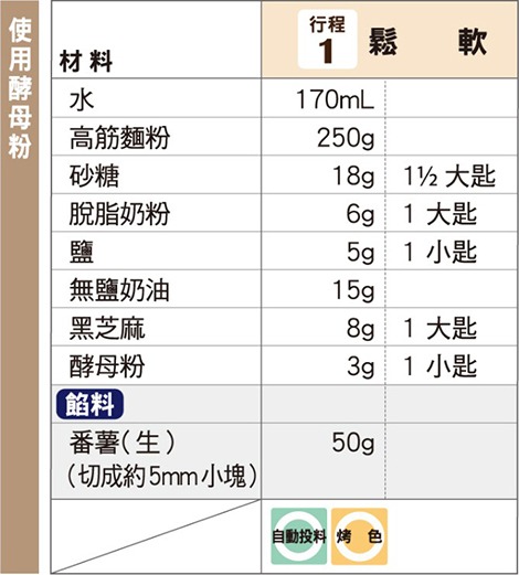象印食譜»製麵包機食譜»吐司»鬆軟吐司»芝麻番薯吐司 製麵包機食譜 芝麻番薯吐司 番薯和芝麻相互搭配的吐司。讓番薯的甜味在口中擴散開來。 作法 將番薯切成約5mm小塊,放入投料盒內,再安裝至上蓋。 將1以外的材料,依材料表由上而下的順序放入麵包容器。 以「行程」鍵選擇行程編號「1」,再按下「開始」鍵。 《 回列表頁 上一道 下一道