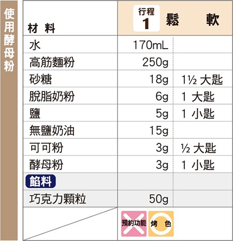象印食譜»製麵包機食譜»吐司»鬆軟吐司»巧克力吐司 製麵包機食譜 巧克力吐司 可可粉麵團中加入了許多巧克力顆粒, 最適合當點心來享用。 作法 將巧克力顆粒以外的材料,依材料表由上而下的順序放入 麵包容器。 以「行程」鍵選擇行程編號「1」,再按下「開始」鍵。 投料蜂鳴聲響起後,放入巧克力顆粒。 《 回列表頁 上一道 下一道