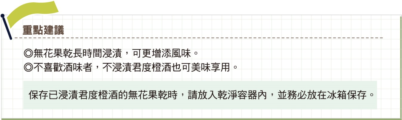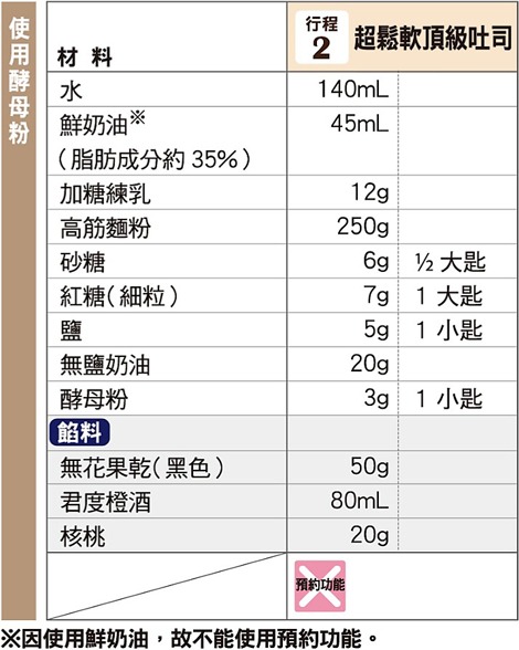 象印食譜»製麵包機食譜»吐司»超鬆軟頂級吐司»超鬆軟頂級・無花果吐司 製麵包機食譜 超鬆軟頂級・無花果吐司 富有嚼勁紮實口感的無花果吐司。 烘培過的核桃更襯托出清甜風味。 作法 將無花果乾切成約 1.5 cm 小塊。 (若有蒂頭請去除。) 將1和君度橙酒放入小容器中,浸漬約30分鐘後,倒至篩網充分瀝乾水 分。 利用平底鍋以小火翻炒(烘培)核桃5~10分鐘,直至表面呈現烤色。 將3冷卻至常温後,切成 5~7 mm的塊狀。 將2和4以外的材料,依材料表由上而下的順序放入麵包容器。 以「行程」鍵選擇行程編號「2」,再按下「開始」鍵。 投料蜂鳴聲響起後,放入2和4。 《 回列表頁 上一道