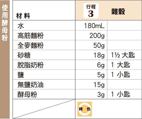 象印食譜»製麵包機食譜»吐司»雜穀吐司»全麥吐司 製麵包機食譜 全麥吐司 全麥麵粉是整顆小麥研磨而成。 含有大量的食物纖維和礦物質。 作法 將材料依材料表由上而下的順序放入麵包容器。 以「行程」鍵選擇行程編號「3」,再按下「開始」鍵。 《 回列表頁 上一道 下一道