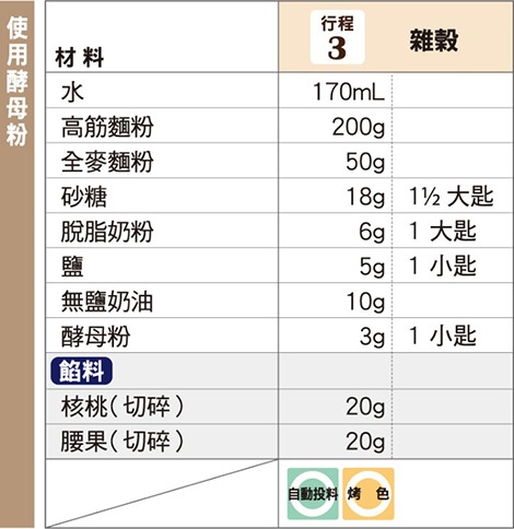 象印食譜»製麵包機食譜»吐司»雜穀吐司»全麥堅果吐司 製麵包機食譜 全麥堅果吐司 添加 2 種堅果,散發自然香氣,入口後更有嚼勁。 作法 核桃和腰果切碎,放入投料盒內,再安裝至上蓋。 將1以外的材料,依材料表由上而下的順序放入麵包容器。 以「行程」鍵選擇行程編號「3」,再按下「開始」鍵。 《 回列表頁 上一道 下一道