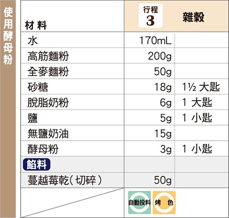 象印食譜»製麵包機食譜»吐司»雜穀吐司»全麥蔓越莓吐司 製麵包機食譜 全麥蔓越莓吐司 蔓越莓的酸甜滋味,襯托出全麥麵粉的樸實及沈穩。 作法 將蔓越莓乾切碎,撒上少許高筋麵粉(份量外)後放入投料盒內,再安裝至上蓋。 將1以外的材料,依材料表由上而下的順序放入麵包容器。 以「行程」鍵選擇行程編號「3」,再按下「開始」鍵。 《 回列表頁 上一道 下一道