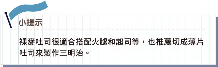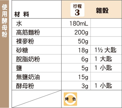 象印食譜»製麵包機食譜»吐司»雜穀吐司»裸麥吐司 製麵包機食譜 裸麥吐司 別有風味的裸麥吐司,愈嚼愈能感覺到豐富美味。 作法 將材料依材料表由上而下的順序放 入麵包容器。 以「行程」鍵選擇行程編號「3」, 再按下「開始」鍵。 《 回列表頁 上一道 下一道