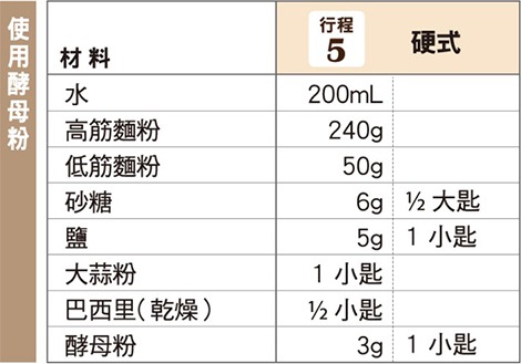 象印食譜»製麵包機食譜»吐司»硬式吐司»硬式大蒜吐司 製麵包機食譜 硬式大蒜吐司 令人無法抗拒的大蒜香氣,更讓人食指大動。 作法 將材料依材料表由上而下的順序放入麵包容器。 以「行程」鍵選擇行程編號「5」,再按下「開 始」鍵。 《 回列表頁 上一道 下一道