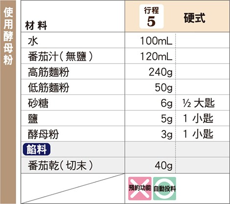 象印食譜»製麵包機食譜»吐司»硬式吐司»硬式番茄吐司 製麵包機食譜 硬式番茄吐司 加入了營養價值高的番茄,盡情享受番茄的好滋味。 作法 將番茄乾切末,撒上少許高筋麵粉 (份量外)後放入投料盒內,再安裝至 上蓋。 將1以外的材料,依材料表由上而下 的順序放入麵包容器。 以「行程」鍵選擇行程編號「5」,再按 下「開始」鍵。 《 回列表頁 上一道 下一道