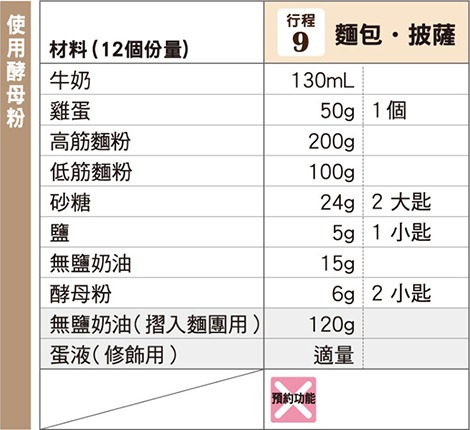 將奶油(褶入麵團用)和蛋液(修飾 用)以外的材料,依材料表由上而下的 順序放入麵包容器。