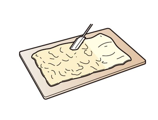 將麵團放在撒有手粉(份量外)的揉 麵板上,以擀麵棍將麵團擀成 40×20cm的長方形,將⅓量(40g) 的褶入麵團用奶油,塗抹於離自己遠 的⅔部分麵團上。 -