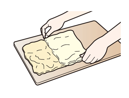 將麵團從靠近自己處折成三折,收口 處確實捏緊,用保鮮膜包好放入冰 箱冷藏30~60分鐘。 重複步驟4和5兩次,再用保鮮膜包 好放入冰箱冷藏約60分鐘。 -