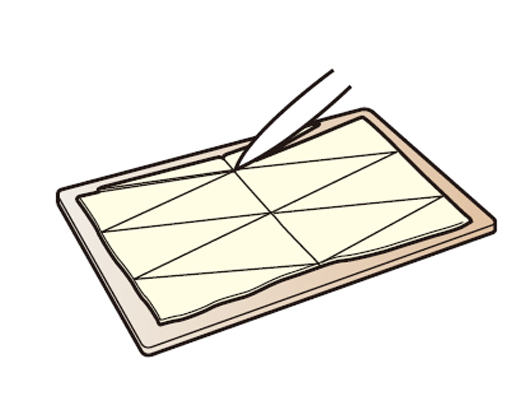 將麵團擀成約5mm厚的長方形,切 成底部寬度約12 c m的等腰三角形 (切成12塊)。 -