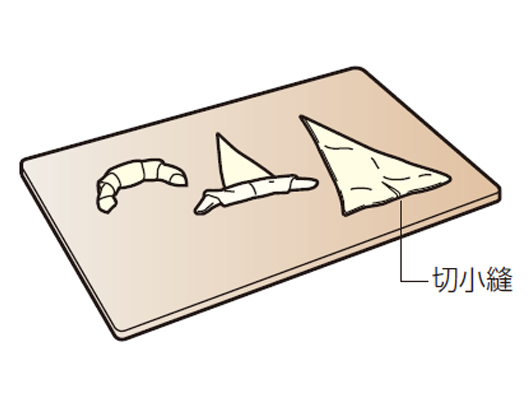 在三角形底部的中央切小縫,由兩 端左右拉開般向前捲成彎月形。 -