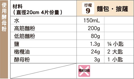 象印食譜»製麵包機食譜»麵團»披薩麵團»披薩麵團(薄皮) 製麵包機食譜 披薩麵團(薄皮) 鬆脆口感的披薩皮。 想輕盈口感時最適合。 作法 將材料依材料表由上而下的順序放入麵包容器。 以「行程」鍵選擇行程編號「9」,再按下「開始」鍵。 從麵包容器取出麵團,分成4等份揉成圓球,蓋上布巾靜置約20分鐘。 將3放在烘培紙上,以擀麵棍擀成直徑約20cm的圓形。 連同烘培紙將麵團移至烤盤,以叉子均勻叉洞。 《 回列表頁 上一道 下一道