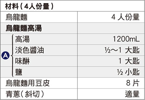 象印食譜»製麵包機食譜»麵團»麵類麵團»豆皮烏龍麵 製麵包機食譜 豆皮烏龍麵 清爽的高湯湯頭搭配香甜豆皮, 匯集成有深度的好味道。 作法 在鍋中放入 A 加熱,製作烏龍麵高湯。 將煮熟的烏龍麵放入大碗中,淋上1並 擺上豆皮和青蔥即可。 《 回列表頁 上一道 下一道