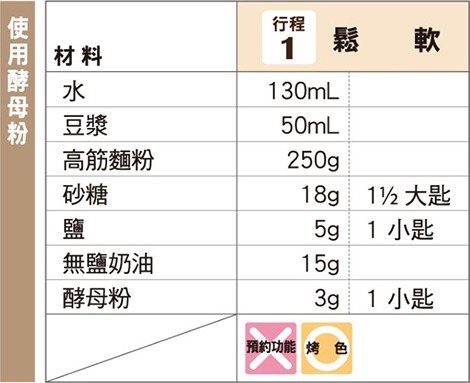 象印食譜»製麵包機食譜»吐司»鬆軟吐司»豆漿吐司 製麵包機食譜 豆漿吐司 含有豆漿純樸甜味的特色吐司。 作法 將材料依材料表由上而下的順序放入麵 包容器。 以「行程」鍵選擇行程編號「1」,再按 下「開始」鍵。 《 回列表頁 上一道 下一道