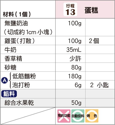 象印食譜»製麵包機食譜»甜點»蛋糕»什錦水果蛋糕 製麵包機食譜 什錦水果蛋糕 紮實的水果乾餡料,每一口都美味。 作法 奶油切成約1cm小塊,回温至常温。 先將 A 混合過篩。 將材料依材料表由上而下的順序放 入麵包容器。 以「行程」鍵選擇行程編號「13」, 再按下「開始」鍵。 投料蜂鳴聲(約13分鐘後)響起後, 使用橡皮刮刀等將沾附在麵包容器周 圍的麵粉確實刮落至底部(刮粉), 再度按下「開始」鍵。 ◎進行刮粉可以使烘烤完成的蛋糕側 面漂亮。 ◎餡料請在刮粉後再放入。 《 回列表頁 上一道 下一道
