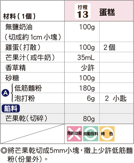 象印食譜»製麵包機食譜»甜點»蛋糕»芒果乾蛋糕 製麵包機食譜 芒果乾蛋糕 添加了酸甜的芒果乾,讓酸味和甜味達到完美平衡的蛋糕。 作法 奶油切成約1cm小塊,回温至常温。 先將 A 混合過篩。 將材料依材料表由上而下的順序放 入麵包容器。 以「行程」鍵選擇行程編號「13」, 再按下「開始」鍵。 投料蜂鳴聲(約13分鐘後)響起後, 使用橡皮刮刀等將沾附在麵包容器周 圍的麵粉確實刮落至底部(刮粉), 再度按下「開始」鍵。 ◎進行刮粉可以使烘烤完成的蛋糕側 面漂亮。 ◎餡料請在刮粉後再放入。 《 回列表頁 上一道