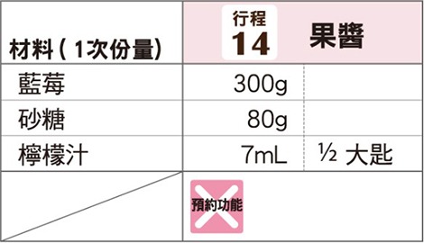 象印食譜»製麵包機食譜»甜點»果醬»藍莓果醬 製麵包機食譜 藍莓果醬 大量使用藍莓製成的奢華果醬。 作法 藍莓稍微壓碎。 將材料依材料表由上而下的順序放入麵包容器。 以「行程」鍵選擇行程編號「14」,再按下「開始」鍵。 《 回列表頁 上一道 下一道