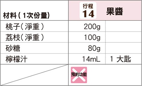 象印食譜»製麵包機食譜»甜點»果醬»蜜桃荔枝果醬 製麵包機食譜 蜜桃荔枝果醬 使用桃子和荔枝製成的奢華果醬。桃子的甜味和荔枝的獨特風味十分搭配。 作法 桃子去除皮和種籽,切成1~1.5cm小塊並稍為壓碎。 荔枝去除皮和種籽,切大塊。 (種籽周圍的褐色部分盡可能挑除。) 將材料依材料表由上而下的順序放入麵包容器。 以「行程」鍵選擇行程編號「14」,再按下「開始」鍵。 《 回列表頁 上一道 下一道