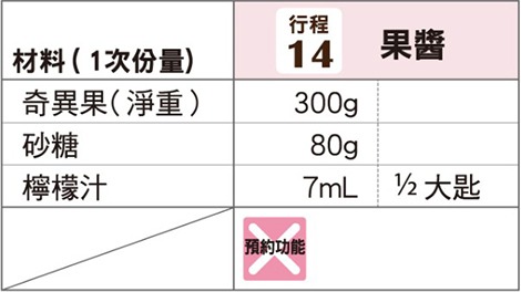 象印食譜»製麵包機食譜»甜點»果醬»奇異果果醬 製麵包機食譜 奇異果果醬 擴散出奇異果酸味的果醬。 種籽的顆粒口感也別具風味。 作法 奇異果去除皮切成2~3mm厚的扇形,稍微壓碎。 將材料依材料表由上而下的順序放入麵包容器。 以「行程」鍵選擇行程編號「14」,再按下「開始」鍵。 《 回列表頁 上一道 下一道