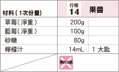 象印食譜»製麵包機食譜»甜點»果醬»雙莓果醬 製麵包機食譜 雙莓果醬 2 種莓類酸甜混合的美味果醬。 作法 草莓去蒂切成2~4等份,稍微壓碎。 藍莓稍微壓碎。 將材料依材料表由上而下的順序放入麵包容器。 以「行程」鍵選擇行程編號「14」,再按下「開始」鍵。 《 回列表頁 上一道 下一道